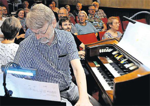 Voigt (rechts) den Stummfilm in Schwarz-Weiss musikalisch auf der Wurlitzer Orgel des